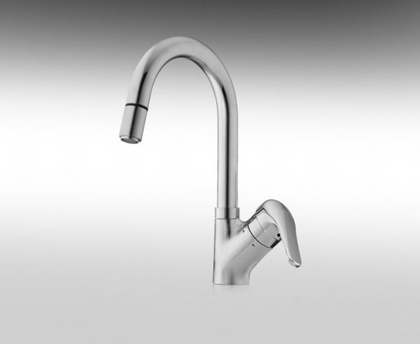ברז מטבח אוורסט, ברז פרח 45 מעלות, פיה גבוהה מסתובבת, מזלף חד מצבי נשלף כלפי מטה.